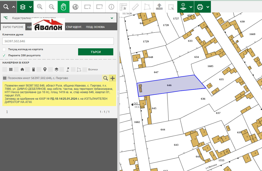 Поземлен имот 56397.502.646, Пиргово, ул. ДИМЧО ДЕБЕЛЯНОВ, вид територия Урбанизирана, НТП Ниско застрояване (до 10 m), площ 1419 кв. м Имотът се намира във високата част на селото посока Мечка, на тихо и спокойно място. В двора има поставен фругон с площ 27 кв.м. с партиди за Ток и вода. Телефон за връзка 0895606165