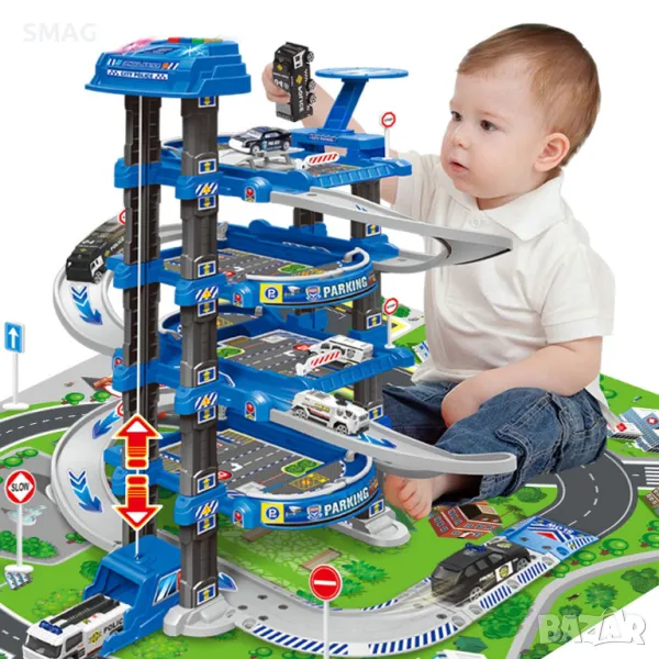 Полицейски гараж с 3 нива, изход за превозни средства, който променя цвета си на 2 от тях, 78x58cm килим с писти, пътни сигнали и самолет (25x27x8.5cm), който отваря носа за превозни средства. В горната част на гаража има полицейски светлини и звуци. Работи с 3 AA батерии (не са включени).