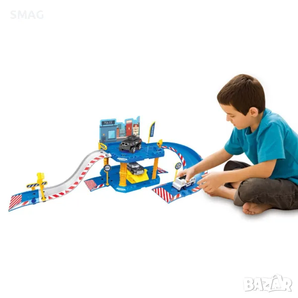 Играчка полицейски гараж на 2 нива с 2 превозни средства в мащаб 1:64.