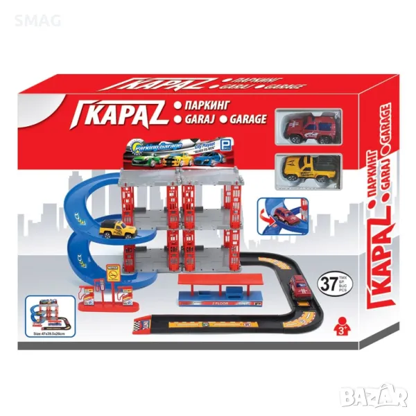 Игра кръгъл гараж на 2 нива и с места за превозни средства. На изхода има и бензиностанция. С 2 6 см метални коли можете да играете и на пода.