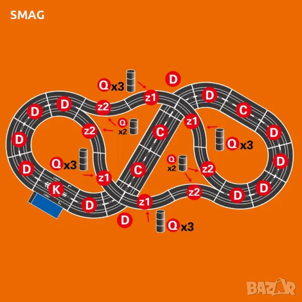 Състезателна писта с лесен монтаж и обща дължина 440 см. Създайте писта с неравни части, двупосочни разделителни линии, завои и предпазители за двата автомобила с включени светлини. Съдържа 2 контрола и турбо бутон, за да кара колите да се движат с висока скорост. Работи с 8 AA батерии (не са включени).
