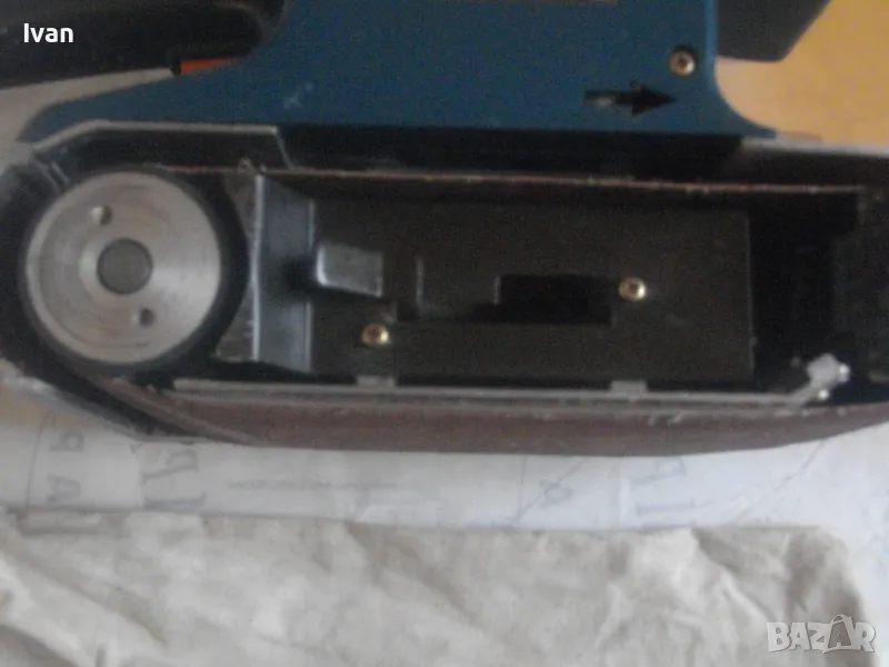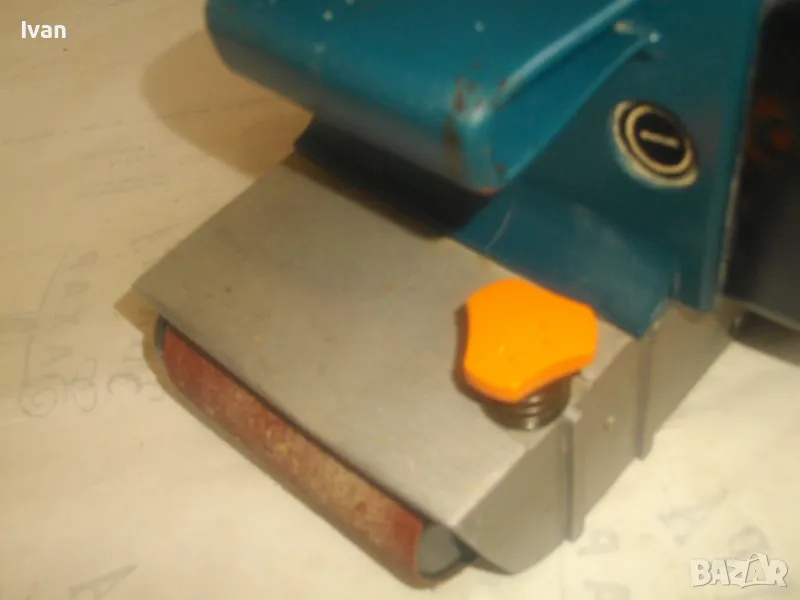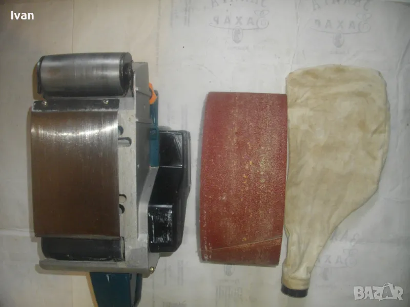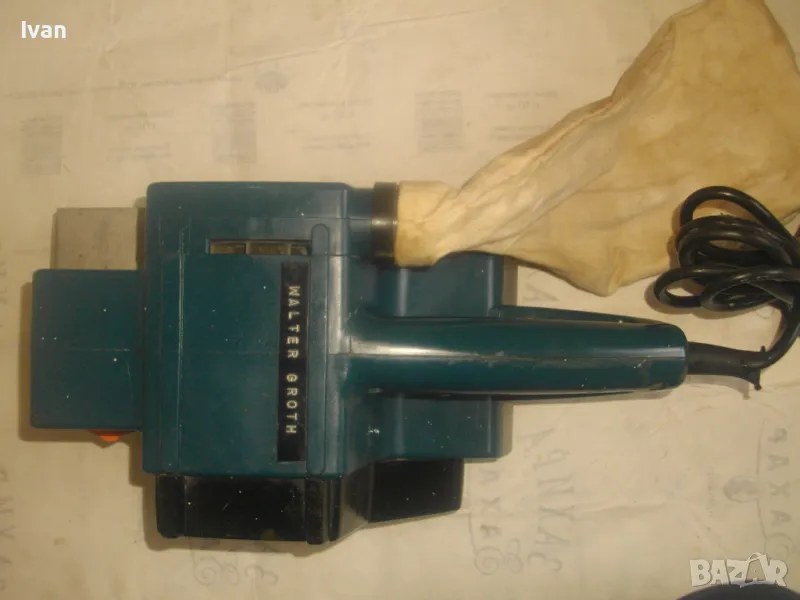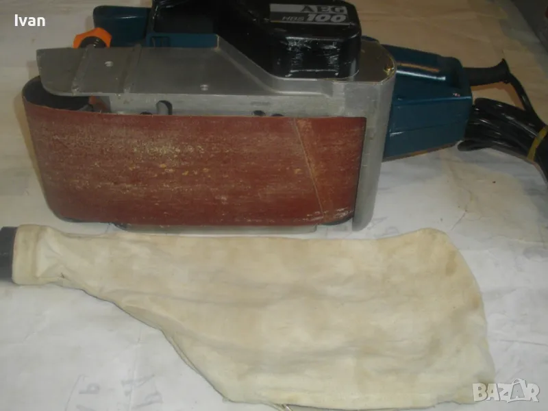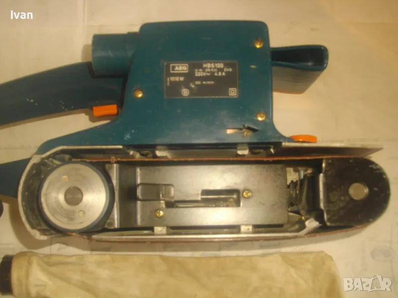 Електрически Лентов шлайф 1010 вата. Немски оригинален на АЕГЕ. Професионален, голям, масивен модел. Марка и модел AEG HBS 100. Оригинално немско-австрийско старо качество и производство на WALTER GROUP. Машината е почти нова, като нова, в отлично визуално и работно техническо състояние. Без забележки. 220 волта, 4,8 ампера, мощност 1010 вата, скорост 350 м/мин. Четки външни. Оригинална торба платова с цип за конектора на отпадъчна прах, поставена оригинална шкурка шкурков пояс лента размер ширина 100 мм. Размери на машината 340 х 170 х 160 мм вис. Тегло - 5,2 кг.