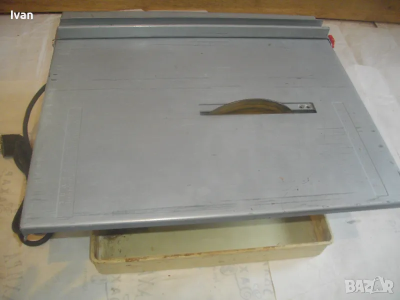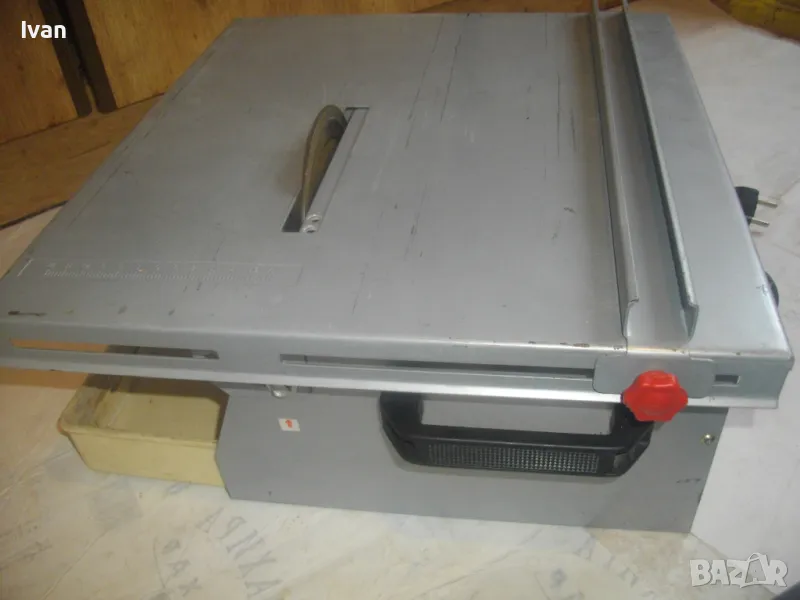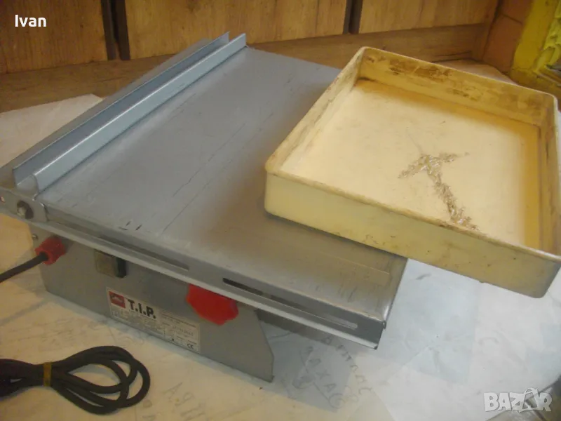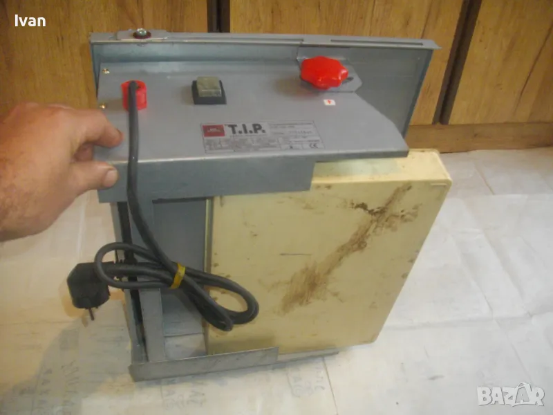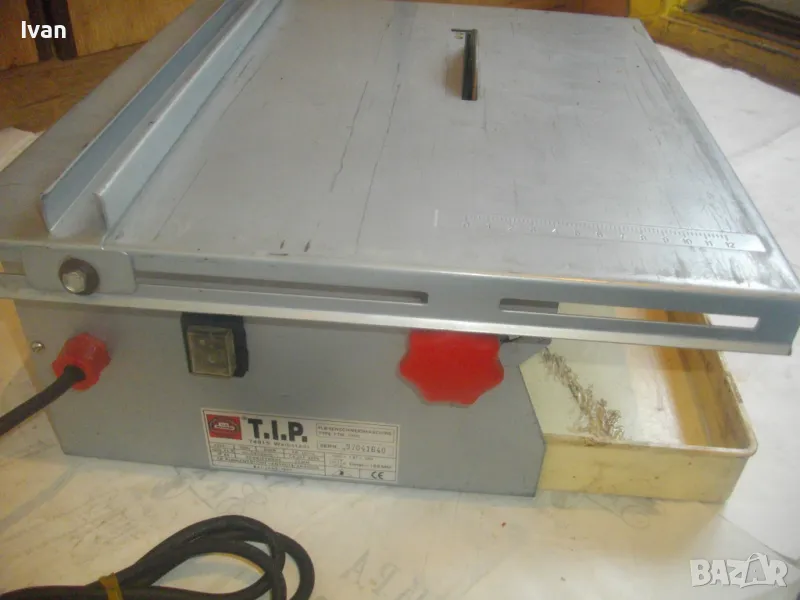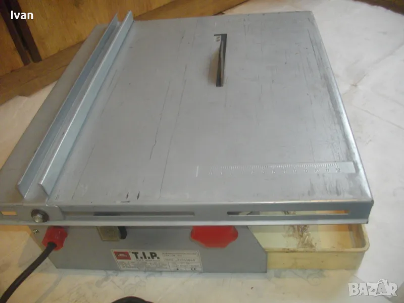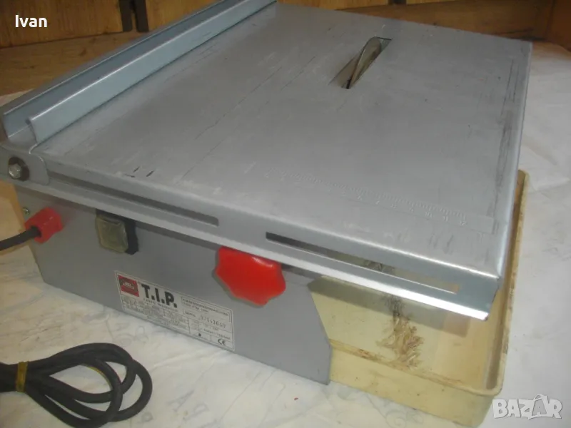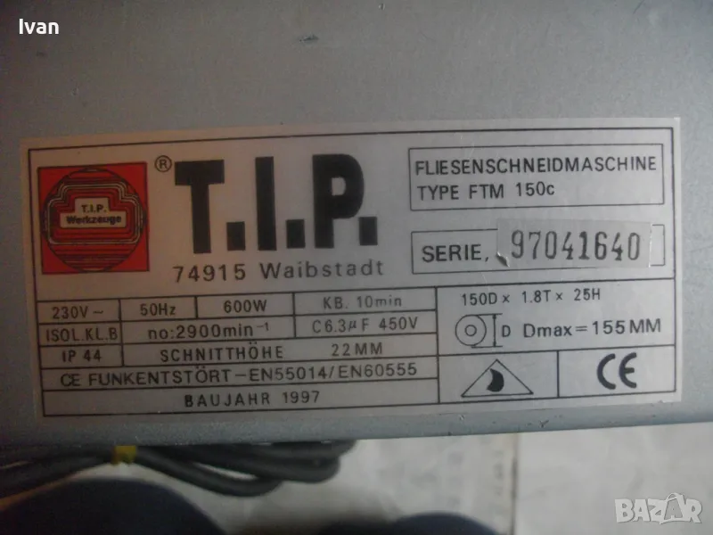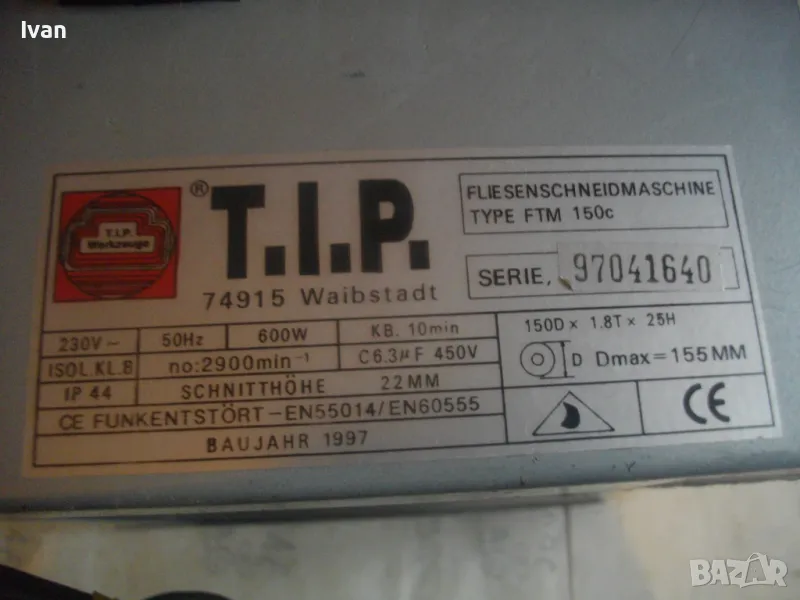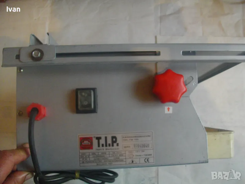 Електрическа машина за рязане на плочки плочи камъни гнайс керамики и други повърхности - за сухо и мокро рязане - с налична оригинална вана за вода и наличен оригинален линеал - цена 299 лв. Марка модел маркировки - T.I.P. Type FTM 150 C Fliesenschneidmachine. Почти нова, много малко е работено с нея. В отлично състояние. Мощност 600 вата, скорост 2900 об/мин. Клас IP 44. Време на работа с 1 пуск - KB 10 min. Диск поставен диамантина почти нова ф 150 мм. Машината е за дискове до макс ф 155 мм. Немско оригинално старо качество производство - 1997 г. Метален плот 380 х 420 мм. Метален изцяло корпус масивен. Вана оригинална за вода, линеал на плота метален оригинален на машината. Линеала е ограничител за рязане по ширина на плоча. Ваната за вода е лепена, имала е леко спуквана по средата, но е залепена много здраво и стабилно. Вградена масивна странична дръжка за носне на машината. Тегло на машината - 12,0 кг. Цена на машината - 299 лв.
