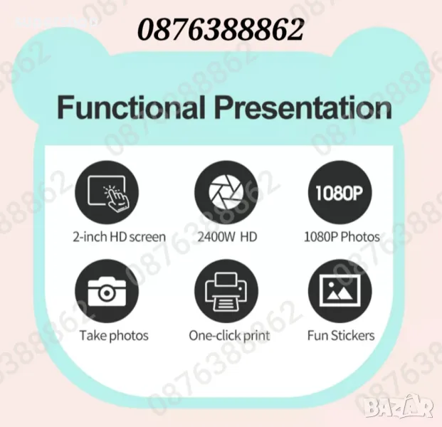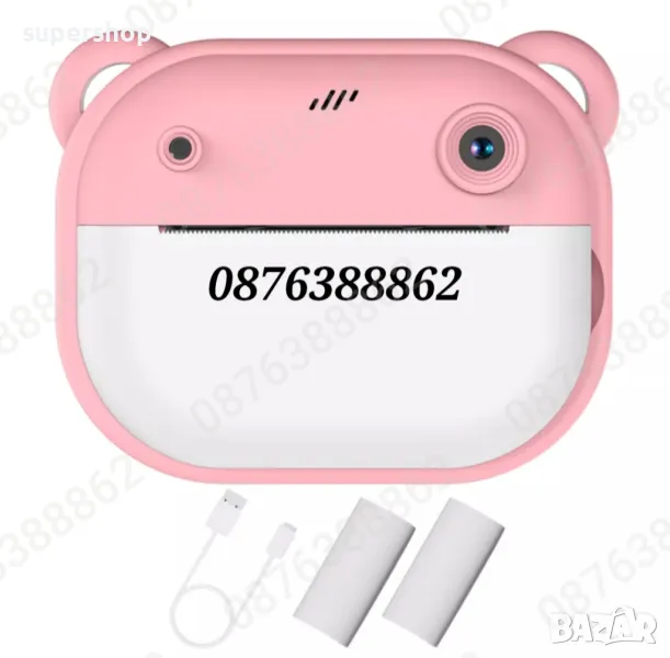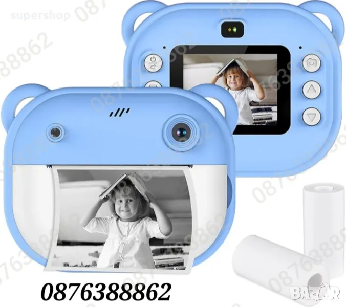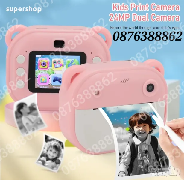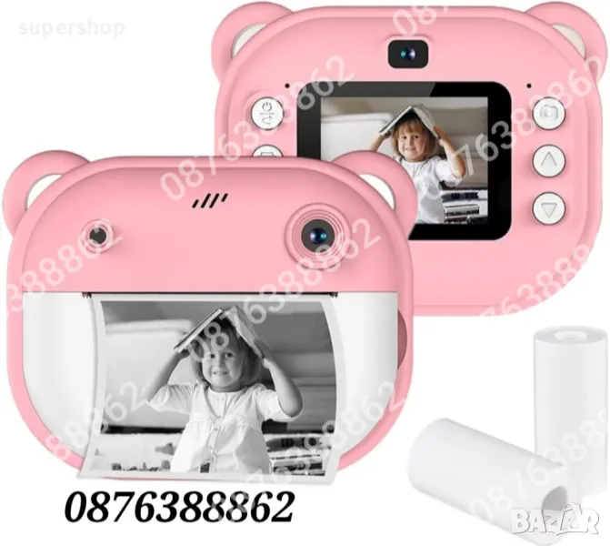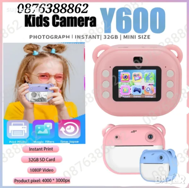 Детски фотоапарат/камера с 2 инчов цветен екран, незабавен печат, принтер за моментални снимки и функции „Направи си сам“, включени забавни игри, поддържа филтри и рамки, МР3 плеър, селфи функция, позволявайки на децата да персонализират своите снимки. Разполага с функции като таймерно снимане, непрекъснат режим на снимане и циклично записване.