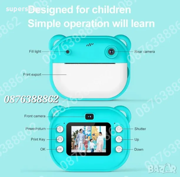 С удобния си дизайн и работа с едно щракване, този фотоапарат е лесен и удобен за използване от деца, което улеснява отпечатването на спомени, като същевременно поддържа компактен и симпатичен външен вид, в син и розов цвят, децата могат да го носят навсякъде, за да заснемат спомени в движение.