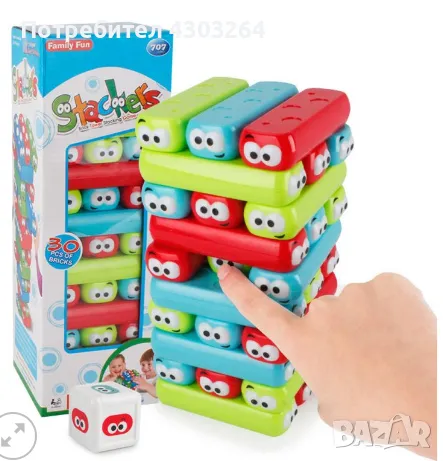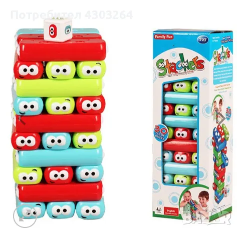 Ако искате да тренирате търпението и сръчността на вашите деца, зарадвайте ги с тази забавна дженга. Класическата игра пристига при малчуганите с многоцветен и забавен стил, с различни картинки. Комплектът е съставен от 30 части. Децата трябва да построят кулата, след това да се редуват да хвърлят зарчето. Играчът трябва да извади внимателно плочка, с картинка, което се е паднало на зарчето.