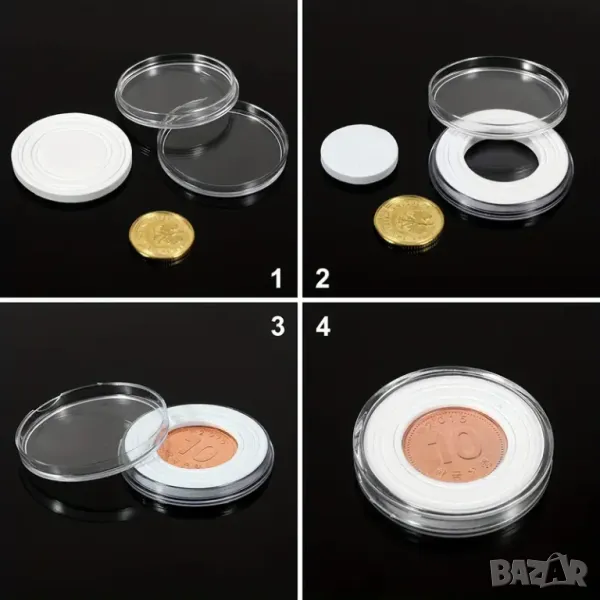 Кутия с 100 броя капсули за монети - до 30 мм с бели регулатори → Обява 48015189