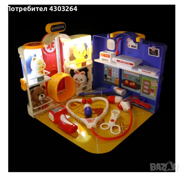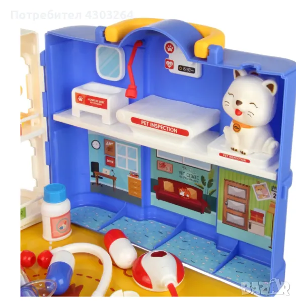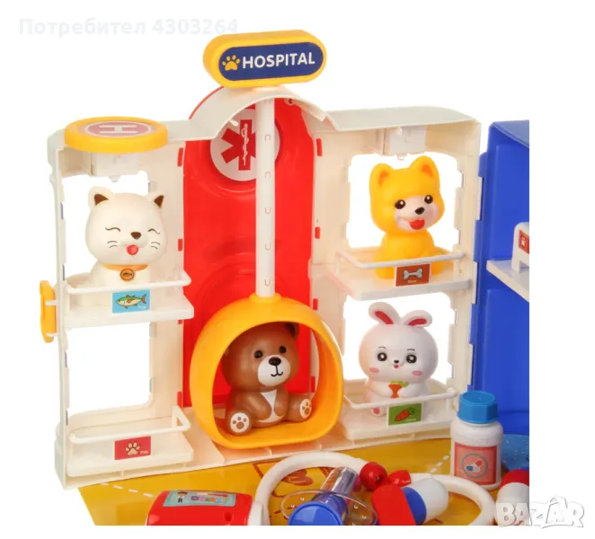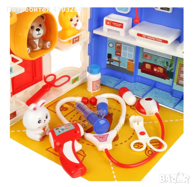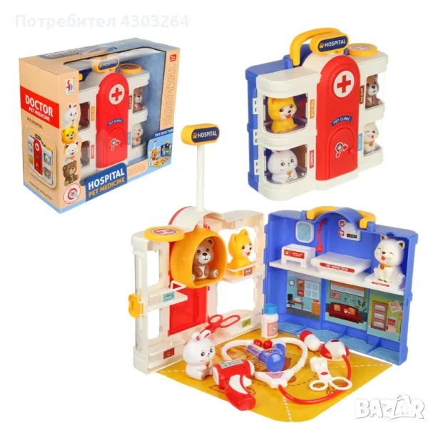 Медицинските инструменти за игра са безопасни за децата и лесно се побират в двуетажната къща. Ветеринарният комплект за сюжетни и ролеви игри включва къща, 4 фигурки на животни, стетоскоп, термометър, щипка, ножица, буркан за лекарства, спринцовка, 2 хапчета, картонена подложка, стикери. Вратата се отваря, къщичката се затваря с резе, има дръжка, удобна е за носене.