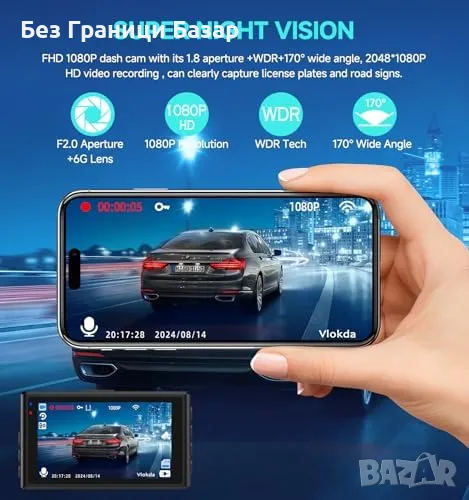 Двойна камера с Full HD резолюция: Предна камера с 170° широкоъгълен обектив и задна камера със 140° ъгъл за ясни записи ден и нощ.