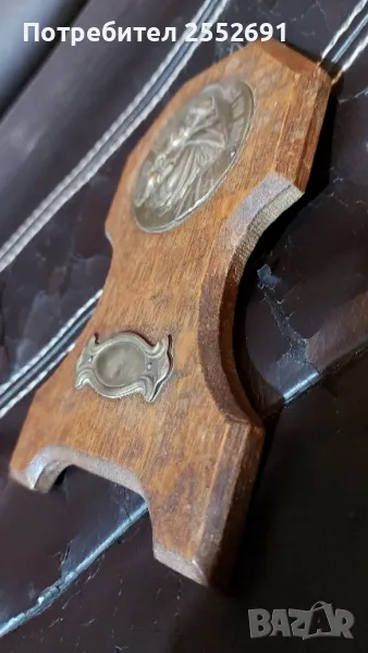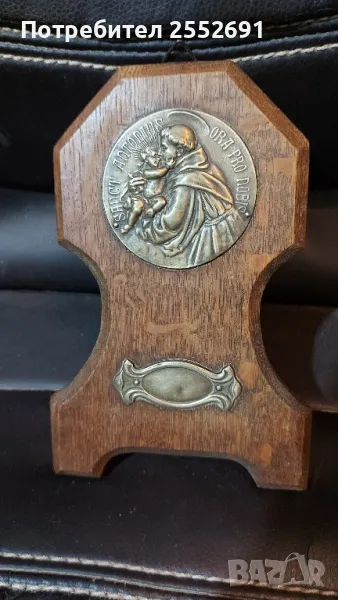 Религиозен плакет на дървена основа за стена. Наличие на надпис "SANCT ANTONIUS ORA PRO NOBIS" Размери 17/10,5/1,5см.
