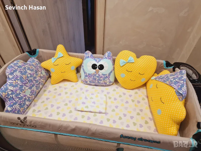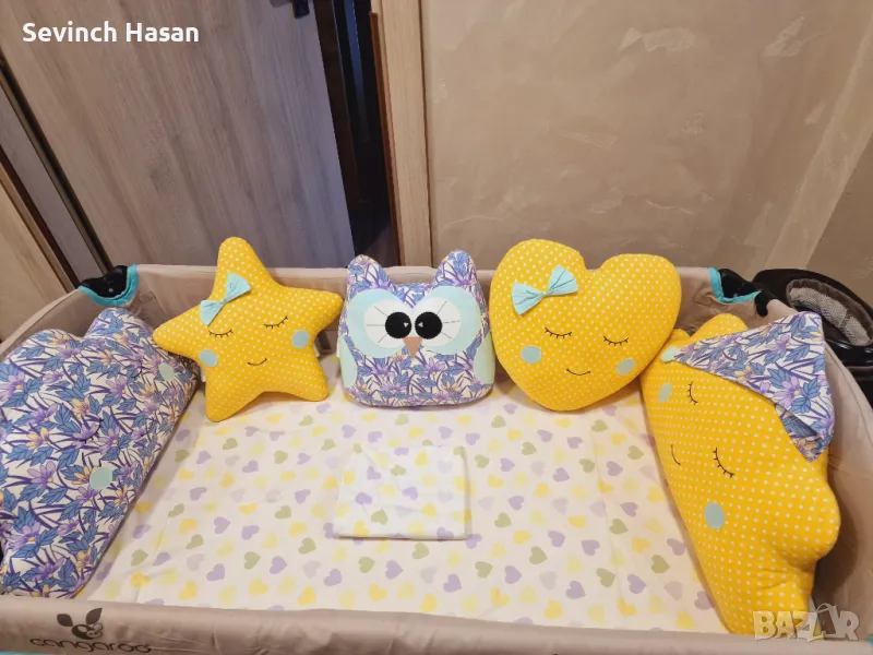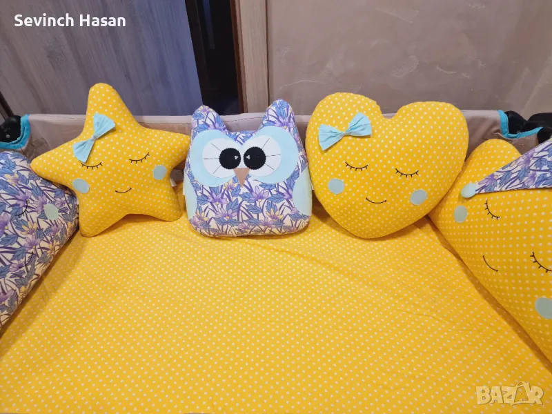 Изключително запазен бебешки обиколник за кошара със закачливи възглавнички от висококачествен и плътен пълнеж, който не се свива при пране. Предлагам комплекта в два десена- с жълто чаршафче с ластик за матрак 60/ 120 и втори вариант- с чаршаф без ластик, с включена калъфка за възглавница. Обиколникът е купуван на цена 130лв. Възглавничките могат да се ползват поотделно, като декоративни
