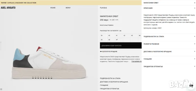 Горната част на ръчно изработените маратонки Orbit е изработена от кожа и велур и е щампована с фино златно лого на Axel Arigato. Малко по-високият ток от гума, омекотената подложка и поддържащата стелка осигуряват специален комфорт при носене. Дантелите са изработени от комбинация от органичен памук и рециклирани материали.