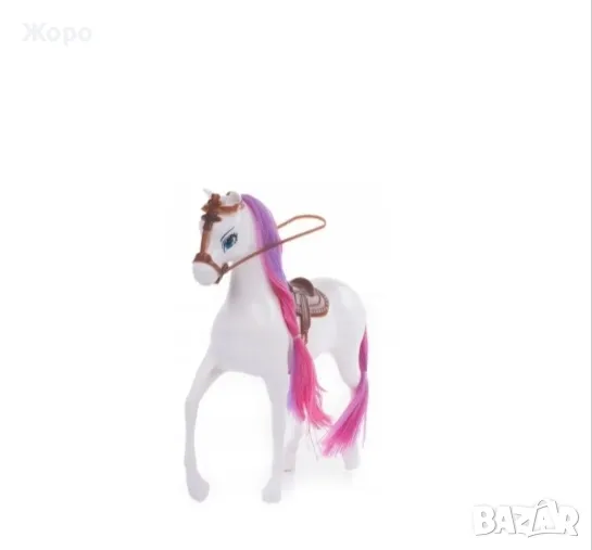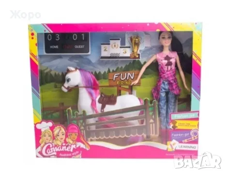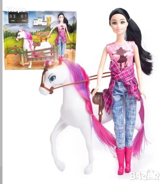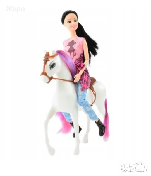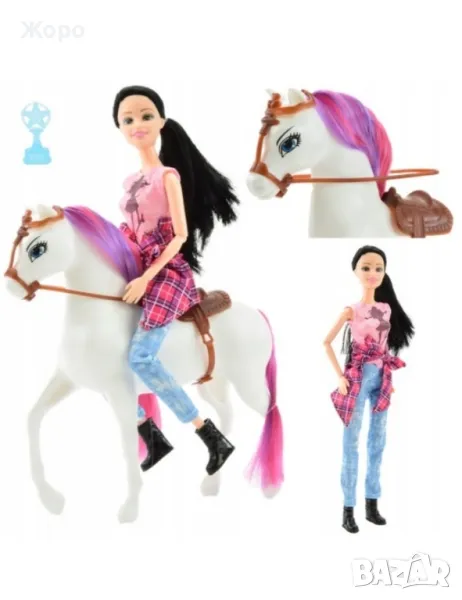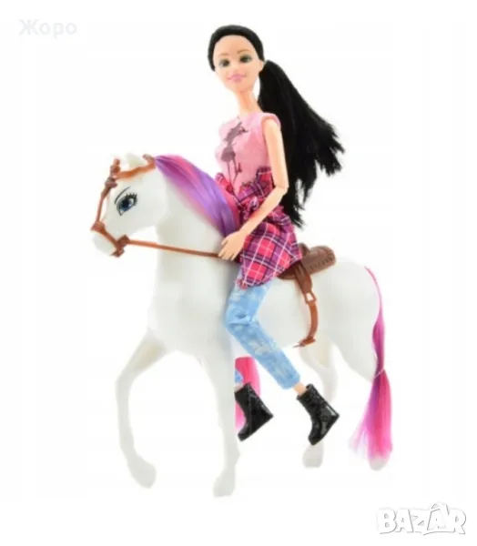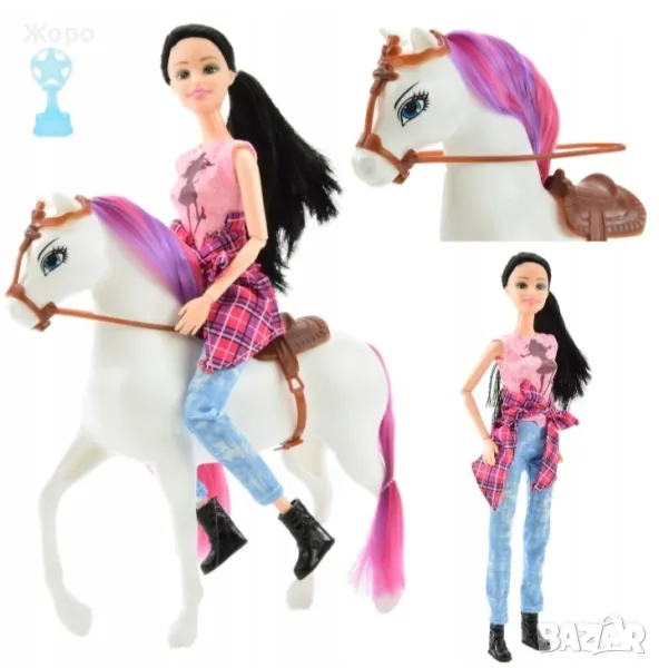 Комплектът е предложение за всеки любител на конните надбягвания, кукла жокей с височина 32 см. и чупещи се ръце и крака.с кон с буйна, розова грива. Играчка, която ще позволи на всяко момиче много творческа игра. Вашето дете обича ли животни? Запалени сте по конната езда? Това е предложение точно за нея! Куклата е с дълга черна коса, която идеално се съчетава с облеклото на истински жокей. Играчката е изработена с внимание към детайла и със сигурност всяко момиче ще иска да тръгне на пътешествие с кобилата си.