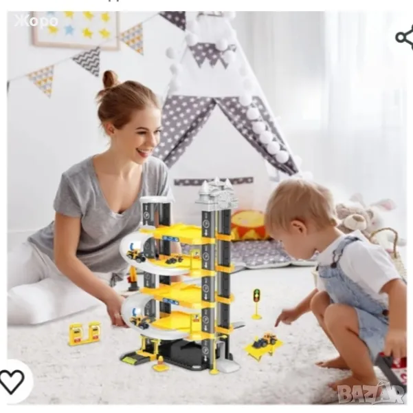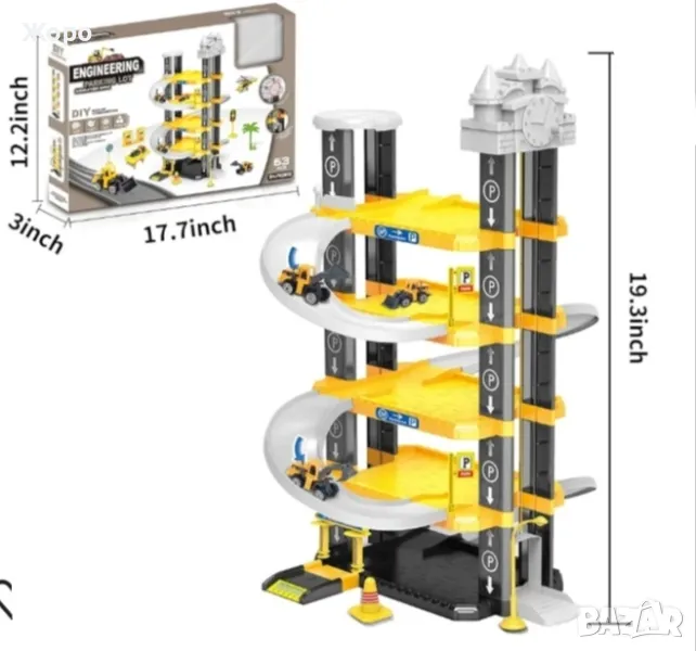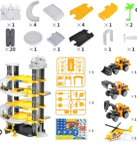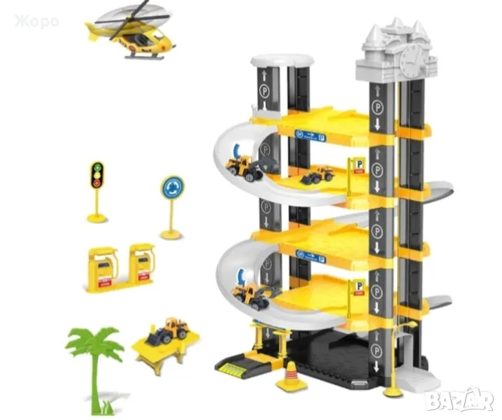 Детски паркинг /писта с автомивка , бензиностанция ,гараж и място за кацане на самолет на 4- нива с асансьор за вдигане на колите от първи до последния етаж оборудван със светофар и лампи за улично осветление и други елементи с три строителни машини и вертолет .Включва 63 пластмасови елемента който създават истинска картина за пътищата и градските улици Подходящ за деца 3+