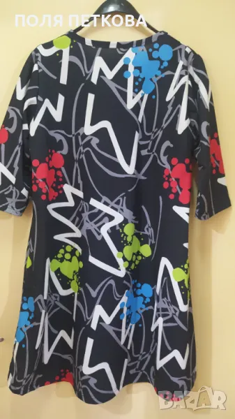 Рокля с шарени принтове на черен фон размер L XL еластична материя гръдна 110 120 надолу тип трапец широк свободен модел ханш 140 цяла дължина 95 см