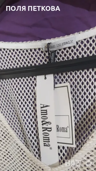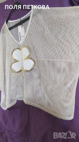 Нова италианска блуза като мрежа със златна ламена нишка цветето е комбинация на бежово със златно много широка свободна може да се носи върху потник върху блуза каквото ви харесва става от размер XL до 4xl 80 см едностранно като гръдна надолу е права цяла дължина 70 см много ефектна и оригинална носи се широко свободно