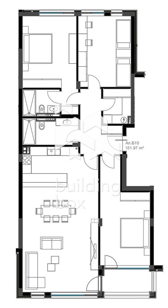 - РАЗПРЕДЕЛЕНИЕ: Просторна всекидневна с кухненски бокс, 3 спални, 2 бани с тоалетна, перално помещение, входно преддверие, тераса. Към апартамента има включена маза с обща площ 7,71 кв.м.