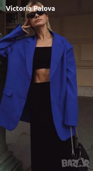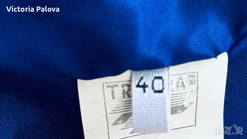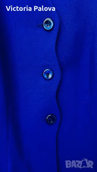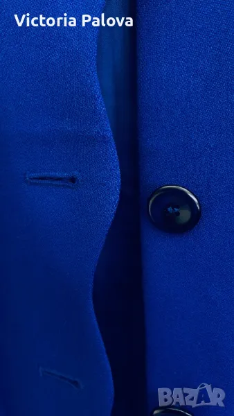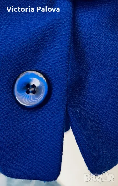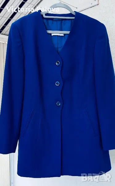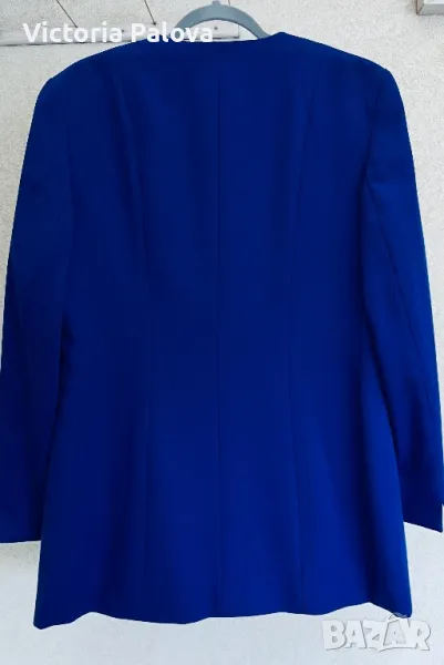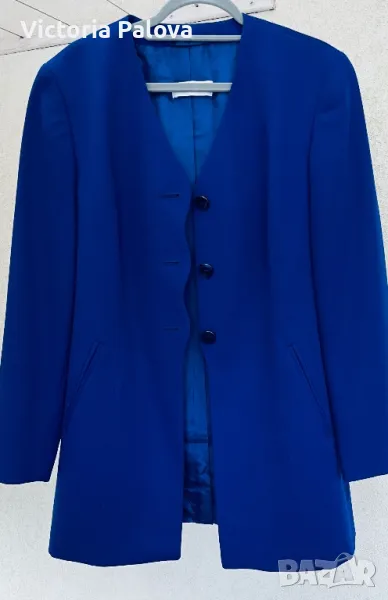Ярко и изключително красиво скъпо сако, 45% вълна, неупотребявано. Особено красиво стои разкопчано, тъй като тогава се вижда зигзагообразната линия на предния борд. Подсилено рамо - 45см, ГО - 52см, леко вталено - 48см, дължина - 80см, ръкав - 61см.