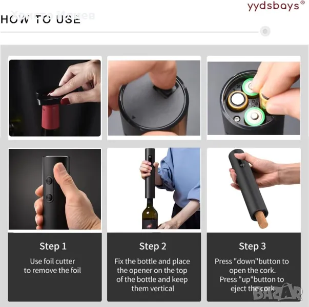 - Лесна работа - Извадете фолиото за секунди с резачка за фолио. Дръжте бутилката здраво с една ръка, а с другата дръжте отварачката за вино над гърлото на бутилката вертикално. Натиснете и задръжте бутона за извличане, едновременно леко натиснете тялото на отварачката надолу, след това постепенно извадете тапата от бутилката за 6-8 секунди и накрая натиснете бутона за освобождаване и задръжте, за да освободите тапата от отварачката. Без притеснения от дърпане, усукване или счупване на тапата на парчета. ГОРЕЩО НАПОМНЯНЕ - Електрическите отварачки за бутилки за вино не са подходящи за тапа с по-стари реколти, тъй като самата тя е по-крехка.