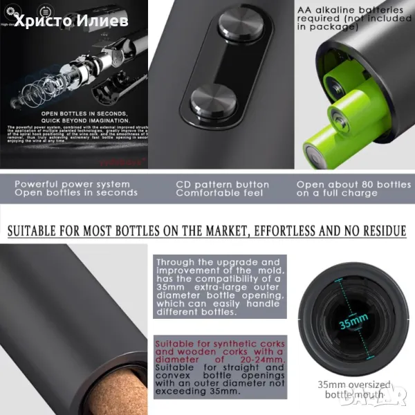 - Мощна и издръжлива - Електрическата отварачка за вино е с мощна и бърза функция за премахване на тапи. Съвместим с повечето размери бутилки за вино. Той може да отпуши до най-малко 80 бутилки наведнъж с 4 броя AA батерии с пълна мощност (тествани с батерии Q-LITE). Безжичен дизайн, така че не е нужно да се притеснявате, че кабелът или USB зарядното ще са в безпорядък на масата ви. Забележка: Необходими са 4 AA алкални батерии при използване (в пакета не са включени батерии).