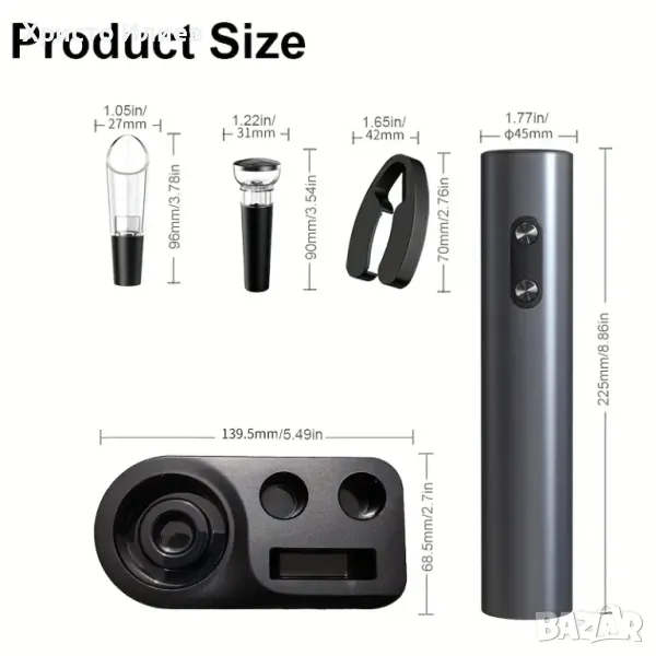 Многофункционален комплект – Все още ли се борите с отварянето на вино? Сега ви предлагаме удобен начин да се насладите на вашето вино. С модерен, интелигентен дизайн, електрическата отварачка за вино отваря бутилки за секунди само с натискане на бутон. Нещо повече, ние предоставяме решение за не само отваряне, но и наливане и съхранение.