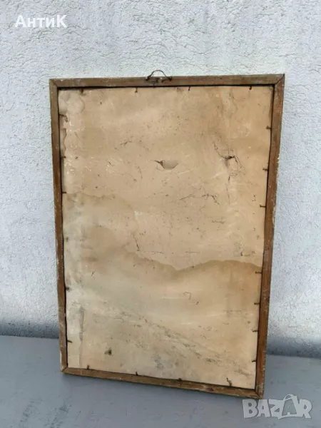 Старо стъклено табло от соц епохата. Технологията е "Боя върху стъкло", рисувано на ръка. Леки забележки в долния десен ъгъл (виждат се на последната снимка).