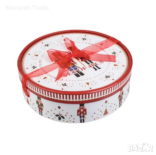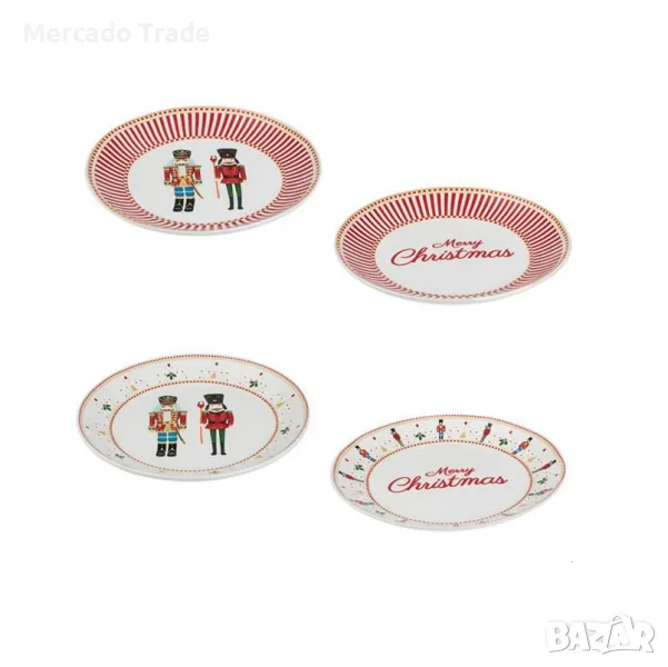 Коледен комплект Merkado Trade, 4бр.,Чинии за сервиране, Коледни войници за сервиране на плодове или десерт, изработени от порцелан, в бял цвят с дизайн на фигурки лешникотрошачки, в красива хартиена опаковка с червена панделка.