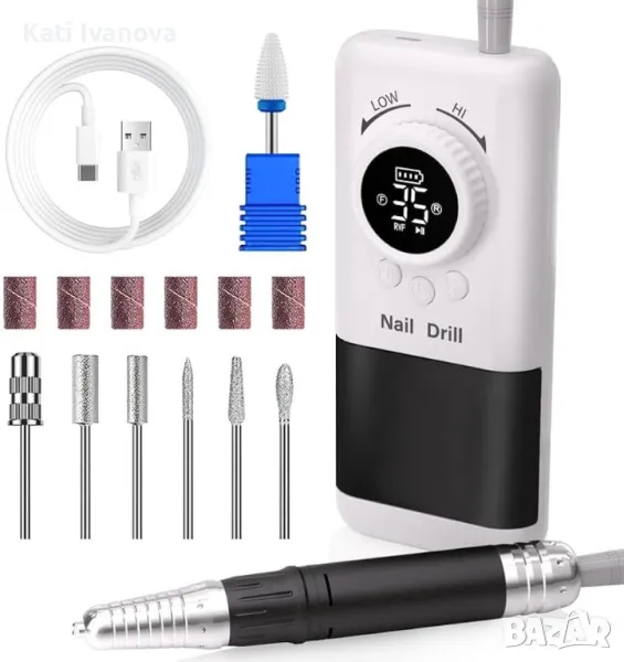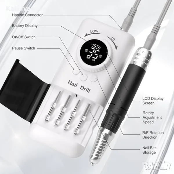 Преносима и издръжлива безжична бормашина за нокти: Професионалната бормашина за нокти Retilio е оборудвана с акумулаторна батерия с голям капацитет, която осигурява дълготрайна мощност. Променете посоката на въртене на бита и скоростта, като завъртите диска. Също така, на LCD дисплея можете ясно да видите скоростта в реално време, посоката на въртене и оставащия заряд на батерията. По-удобно и практично е за управление.