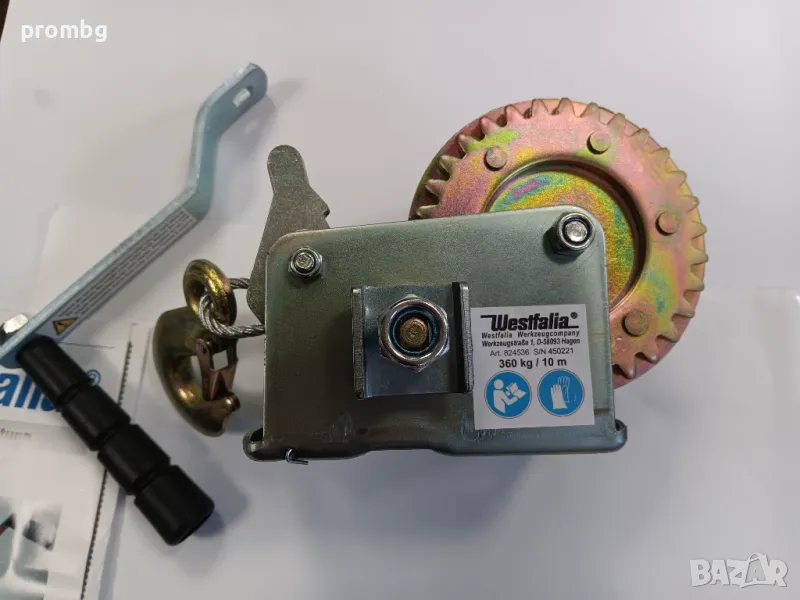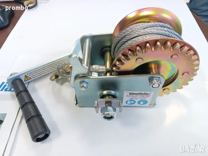 ръчна лебедка Westfalia Германия до 360 кг, високо качество. Дължина на въжето - стоманения кабел 10 мм, диаметър 4мм. Подходяща за ремарке, кола, лодка и др.