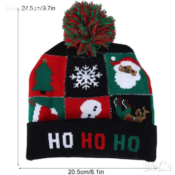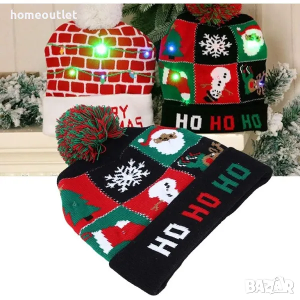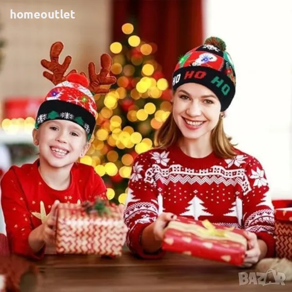 Коледната шапка има 6 лампички (2 зелени, 2 червени и 2 сини) и 3 режима на светене (бързо мигане, бавно мигане, постоянна светлина), захранвани от вградена батерия.