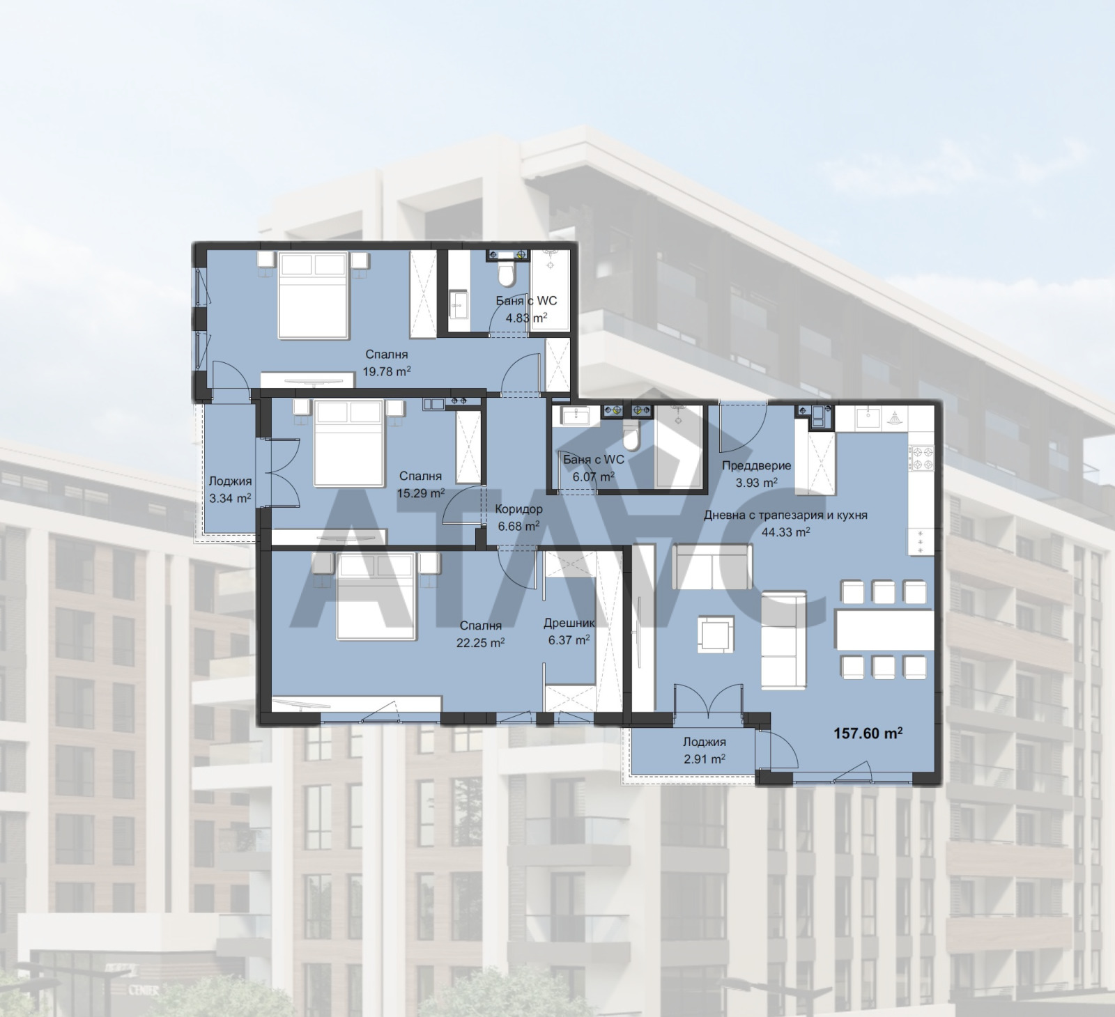 ЧЕТИРИСТАЕН! ЛУКСОЗЕН КОМПЛЕКС! ТОП ЛОКАЦИЯ! ИЗЛОЖЕНИЕ ЮГ ИЗТОК! С удоволствие Ви представяме четиристаен апартамент, част от новостроящ се луксозен комплекс, проектиран с мисъл за реалните нужди на сегашното поколение. Жилището разполага с 158 кв.м. застроена площ, функционално разпрелена в просторен хол с кухненски бокс, голяма родителска спалня със собствена баня, втора спалня с дрешник, трета спалня, второ санитарно помещение, преддверие, две лоджии и прилежащо избено помещение. Прекрасно жилище, подходящо за големи семейства, обичащи простор и ценящи личното си пространство.
