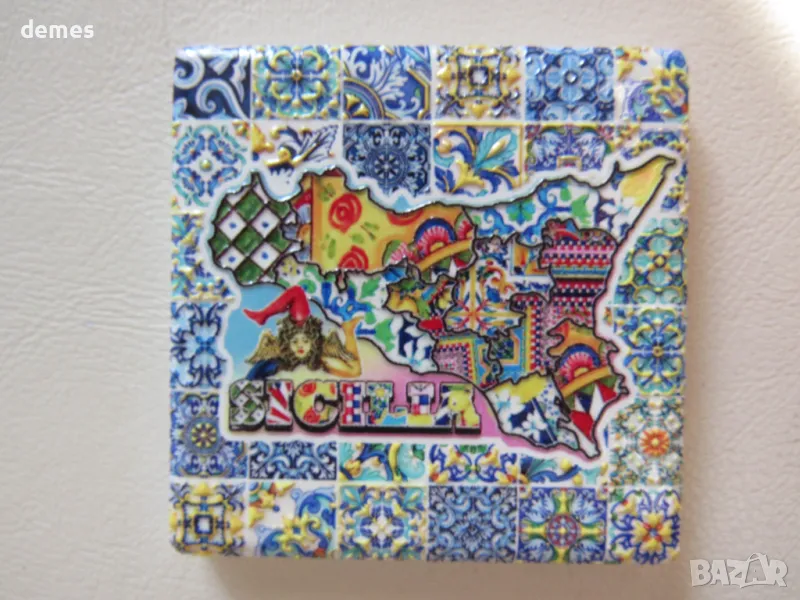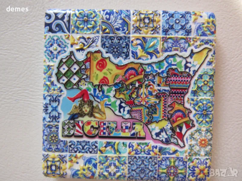 Със символа на Сицилия трискелион – древен гръцки символ на три бягащи крака, излизащи от една точка.