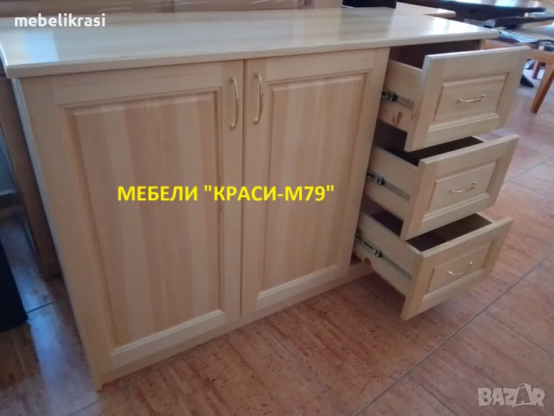 Шкафът е изработен изцяло от естествено дърво - бял бор. С 2 врати с плавно затваряне и 3 чекмеджета с телескопичен механизъм.