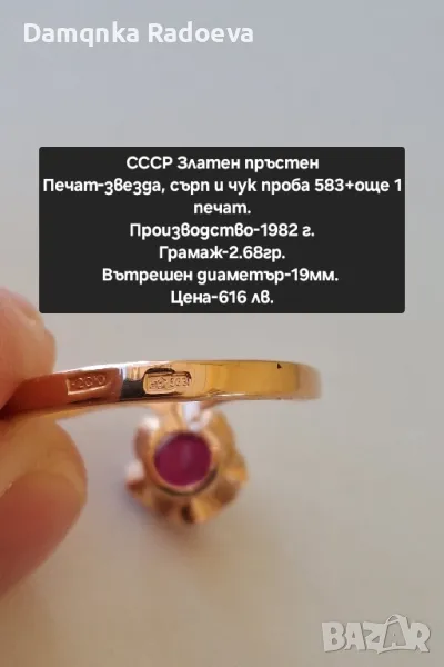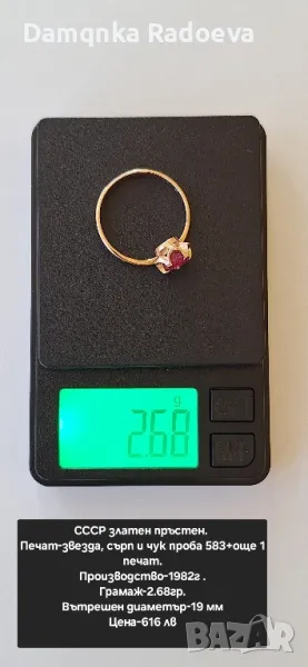 СССР Златен пръстенПечат-звезда, сърп и чуk проба 583+още 1печат.Производство-1982 г.Грамаж-2.68гр.Вътрешен диаметър-19мм. Цена-370 €