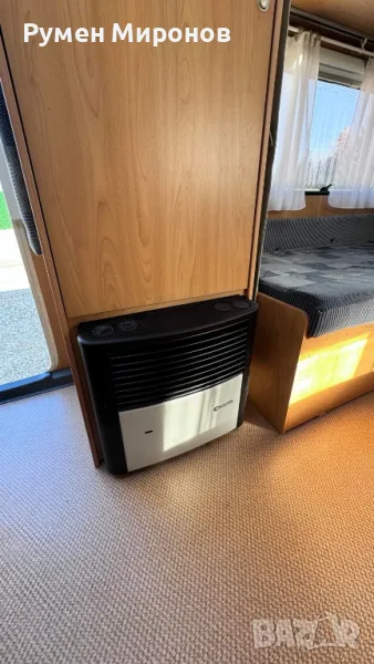 Срещу него гардероб с отоплителна газова двойна печка с обдухване на цялата каравана.