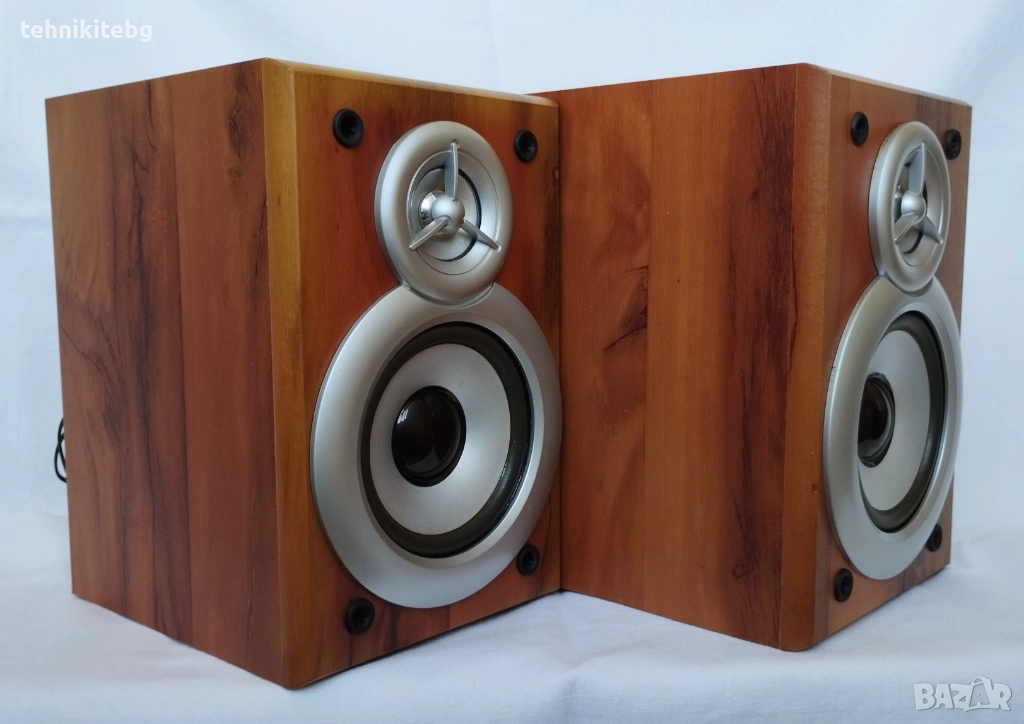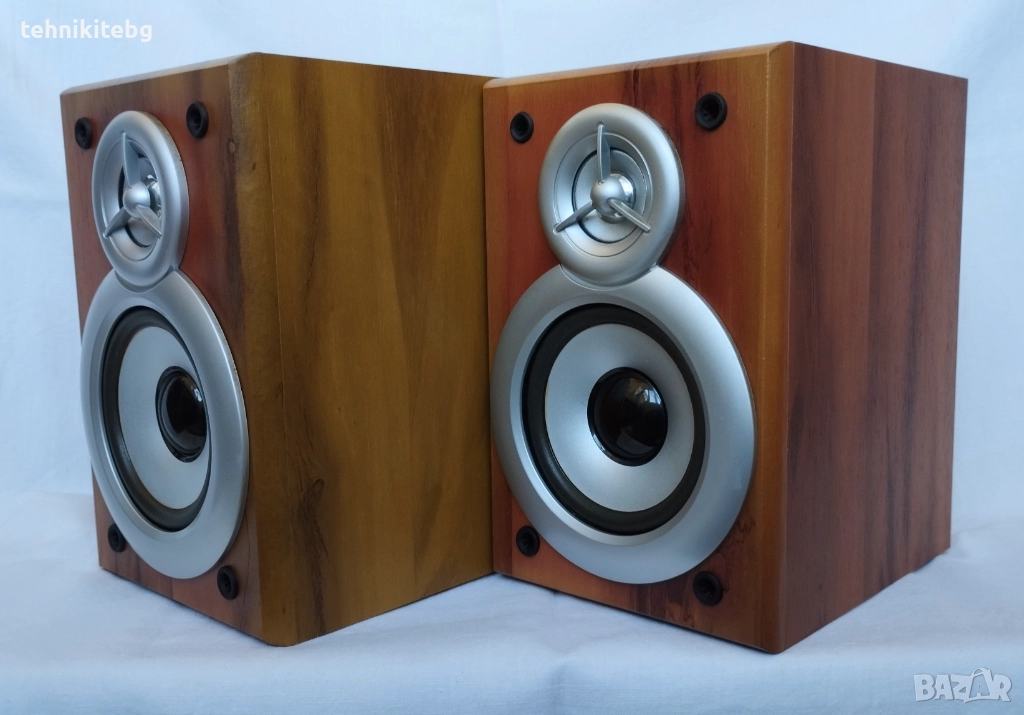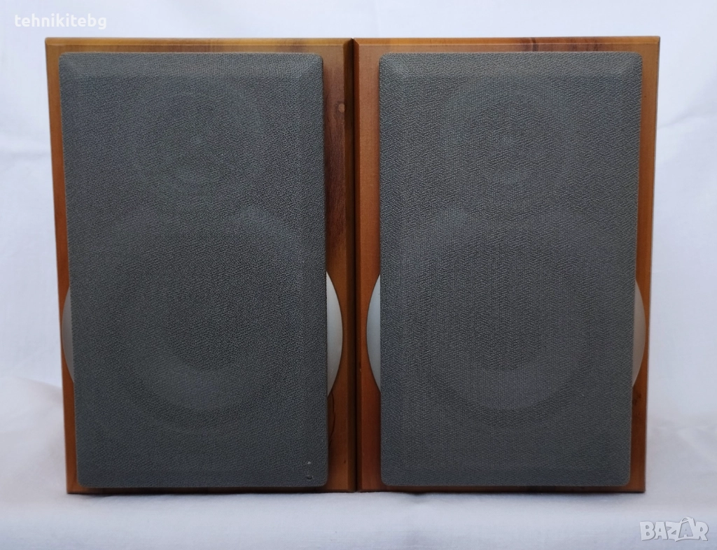 Английски тонколони от система , двулентови , отворен обем със заден басрефлекс , 2 х 8 вата , 4 ома , кутии от MDF , размери 22 х 14 х 18.5 см , тегло 3 кг. двете . Тонколоните са в много добро състояние , едната има леко избелване по фурнира . Лично внесени от Англия .