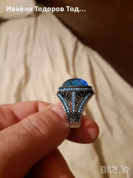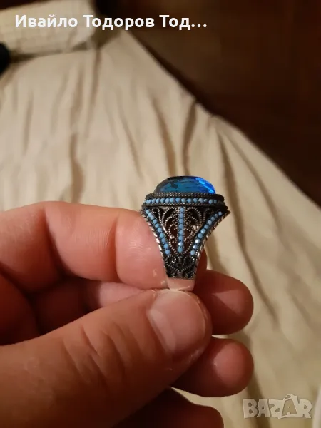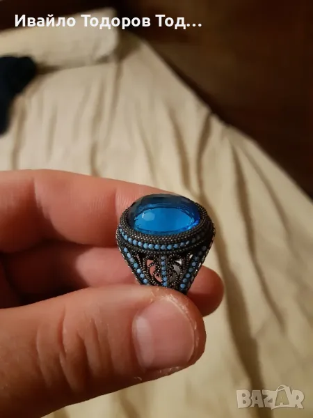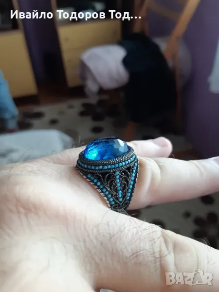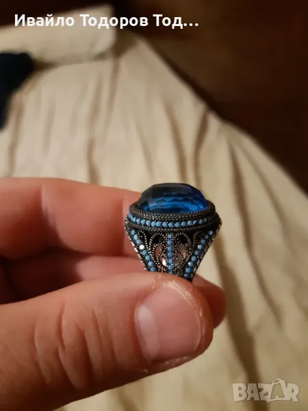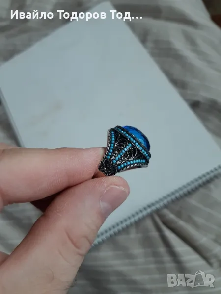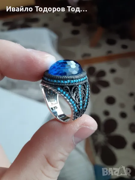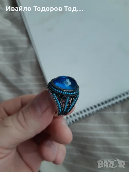 Уникален бутиков сребърен пръстен, ръчна ювелирна изработка с огромен аквамарин. Малките инкрустирани камъчета са сини тюркоази. Теглото на пръстена е 15.96 грама.