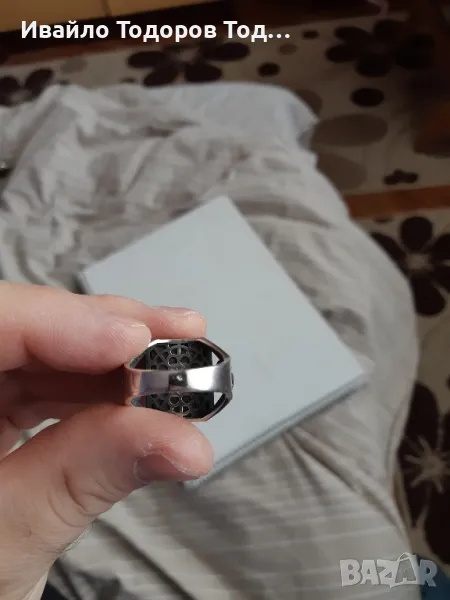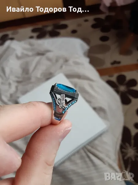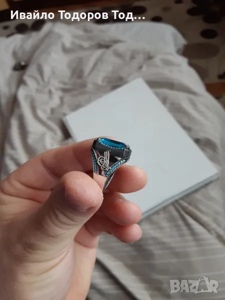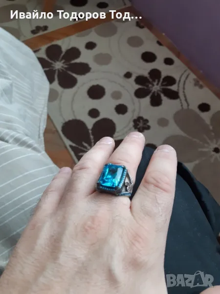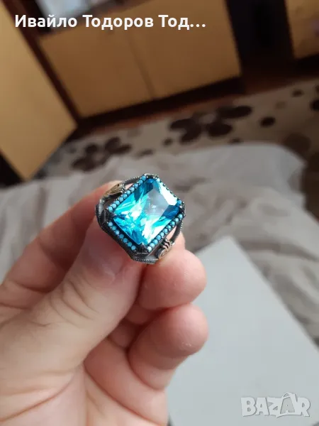 Уникален мъжки сребърен бутиков пръстен с огромен камък - аквамарин. Малките ръчно инкрустирани камъчета са сини тюркоази. Ръчна ювелирна изработка. Закупен е от Венеция, Италия. Теглото му е: 14. 33 грама. Размера му е: 63. С два печата за проба сребро 925.