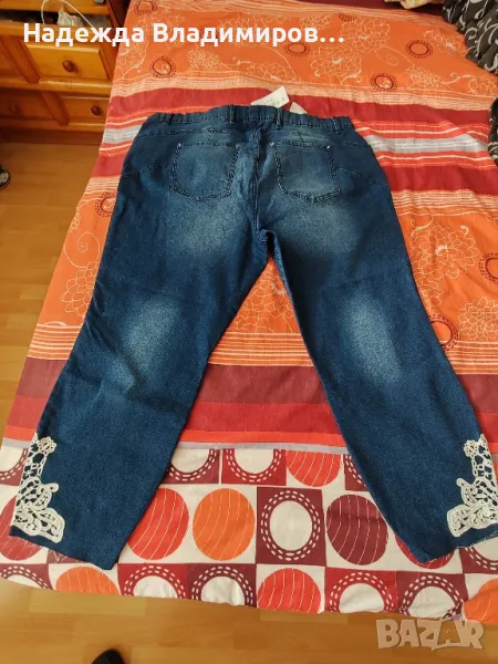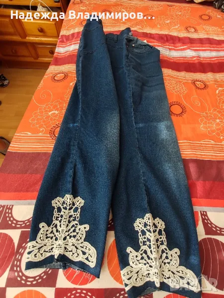 Продавам чисто нови дънки голям размер,с дантелени орнаменти долу на крачолите, и еластичност. Талия 120 см., ханш-130 см., дължина - 90см.