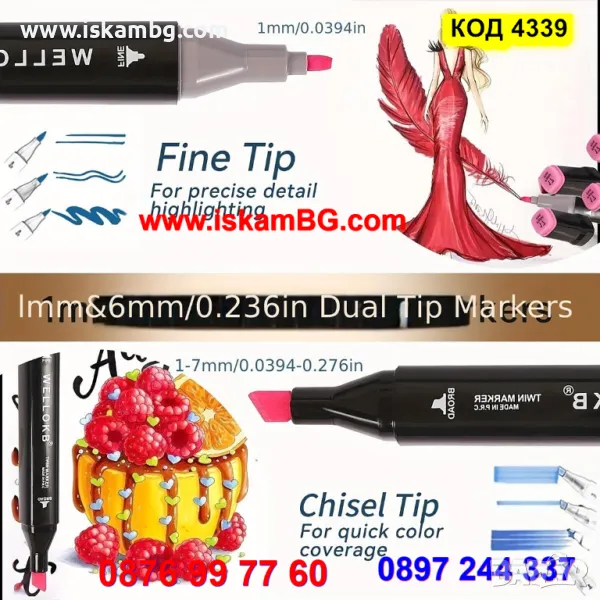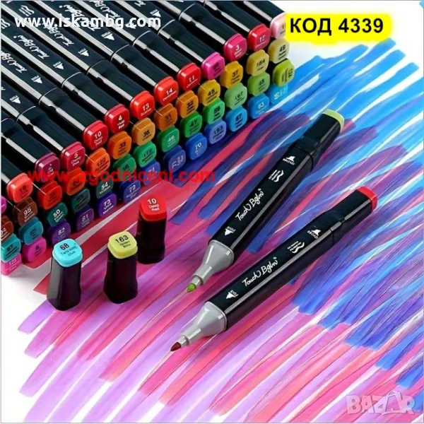 Комплекта с маркери предлага мега голямо разнообразие от цветове, така че не са ви необходими повече за да направите своята картина страхотна. Тези маркери са двулицеви, като от едната си страна са с дебел писец, а от другата с тънък, това дава възможност за рисуване, подчертаване с тех и оцветяване. Освен това с тях можете и да скицираме, пишете и други. Цветовете им са насини, силни и не избледняват, те са с живи цветове. А благодарение на тяхната алкохолна основа те са защитени и от изсъхване. Цветовете им се сливат много лесно, което позволява да ги съчетавате, без проблем.