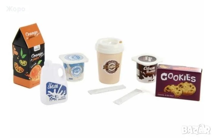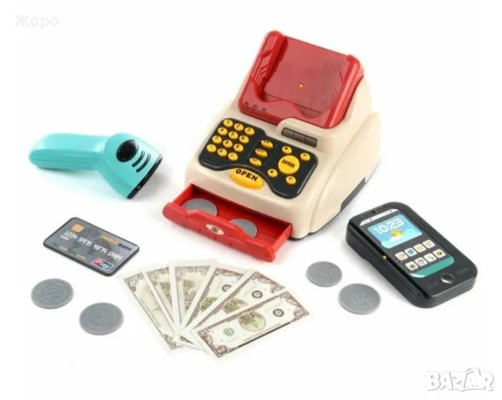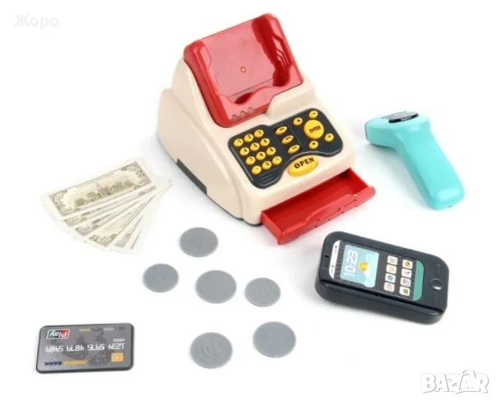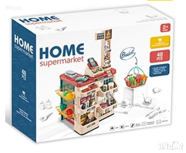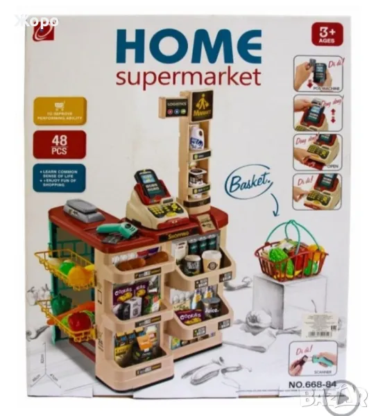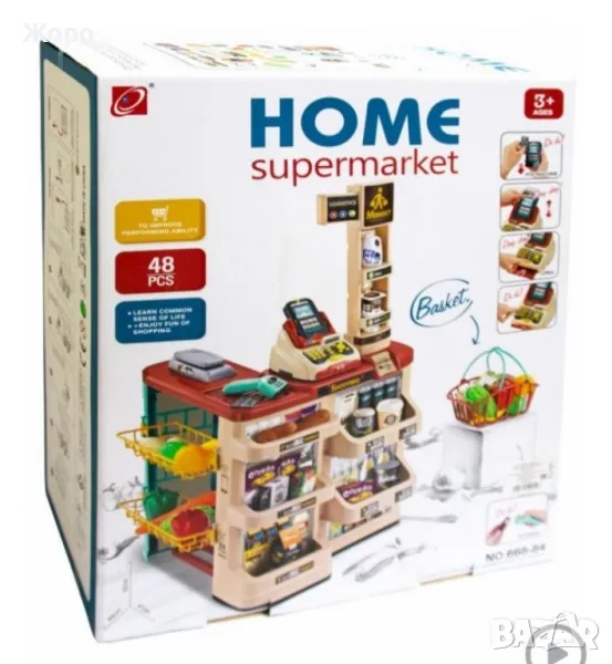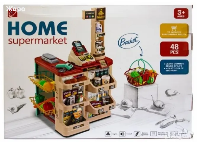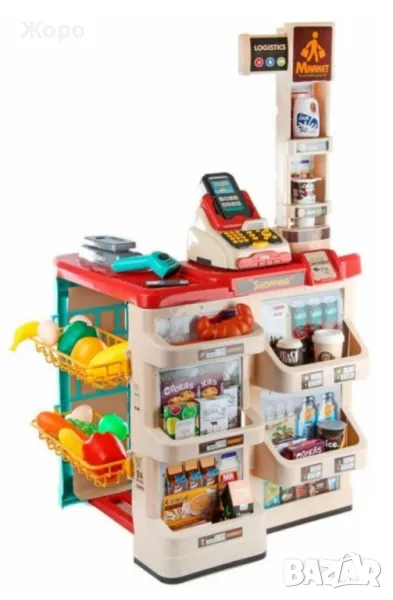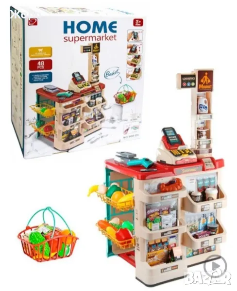 В комплекта са включени цели 48 елемента скенер ,касов апарат , кантар ,всичките са с реалистичен звук и светлина , гише за плащане с всичко необходимо за пазаруване и плащане на различни хранителни продукти, ПОС терминал, банкова карта, касов апарат с отварящо се чекмедже, игрални пари, везна и др.