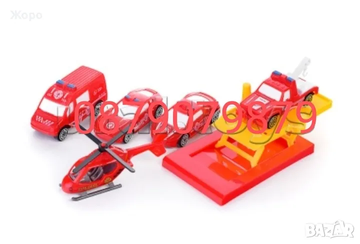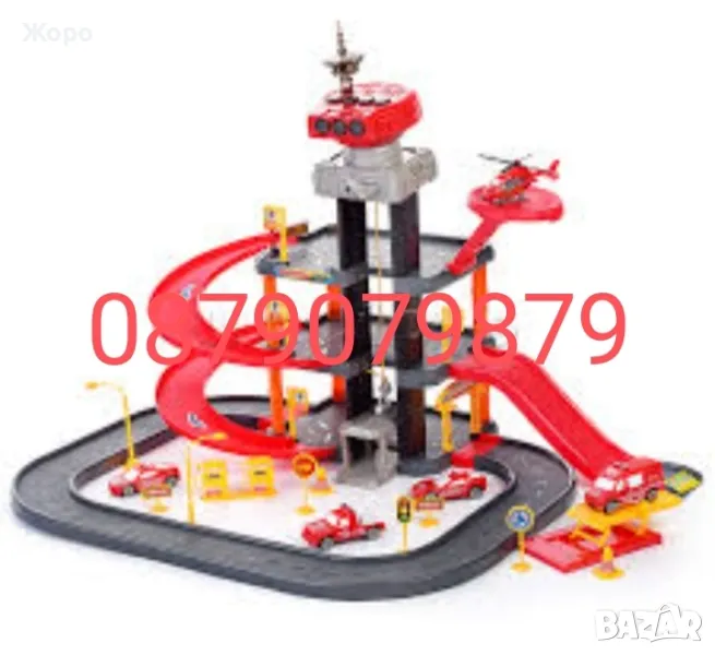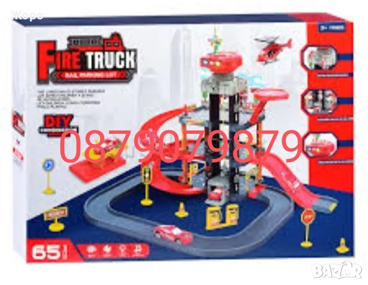 голяма три етажна писта или паркинг с асансьор за вдигане на колите към горния паркинга на последния етаж Играчката разполага се 4 пожарникарски коли и хеликоптер ,светофар и бензиностанция и много пътни знаци, която поотделно или в комбинация с други играчки и коли увеличава креативността и координация на детето и забавлява и занимава го часове на ред