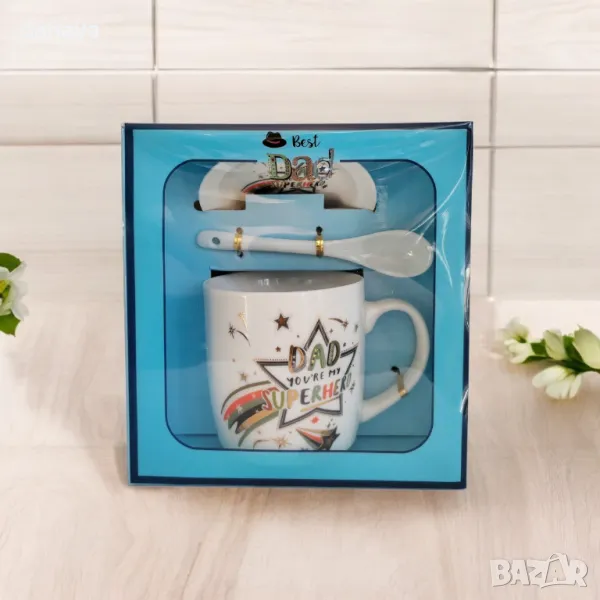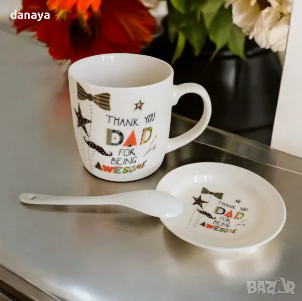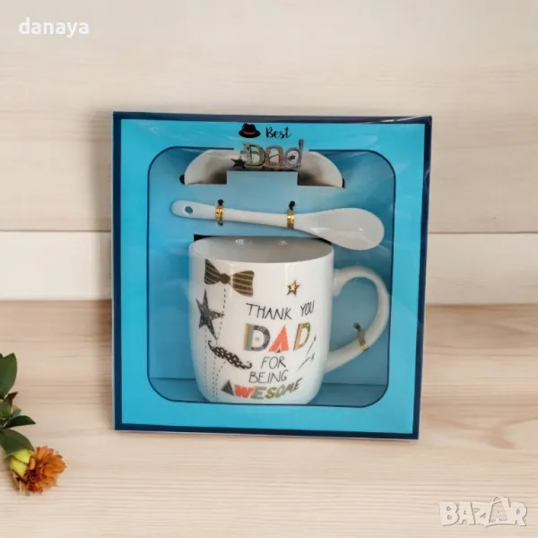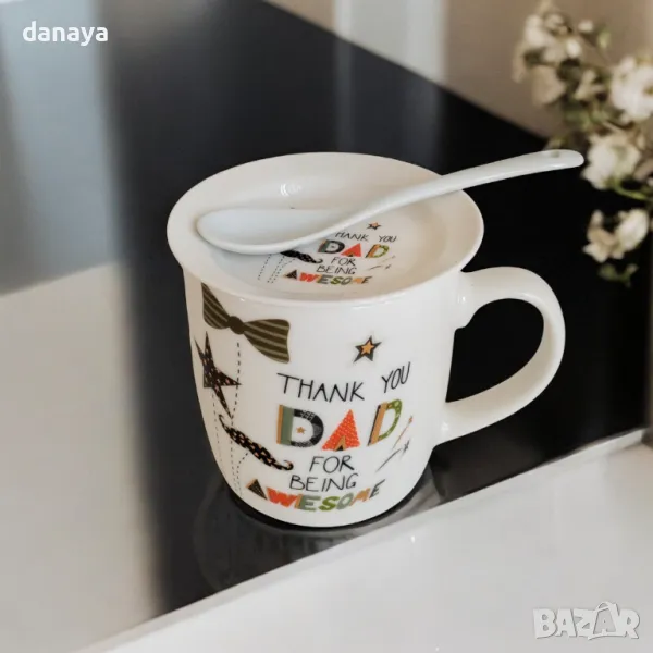 Чаша За Татко, Ден На Бащата, Thank You Dad, Супер Татко, подарък за бащи, подарък за татко, чаша с надпис за бащи, подаръчен комплект, Thank You Dad, подарък за мъж, чаша с капаче и лъжичка, подарък в кутия, оригинален подарък, подарък за баща, изненада за татко.