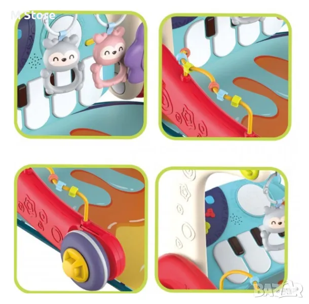 Има 3 позиции за игра: легнало, седнало и изправено (за подпомагане на прохождането на детето);