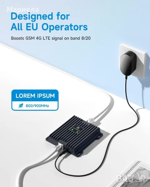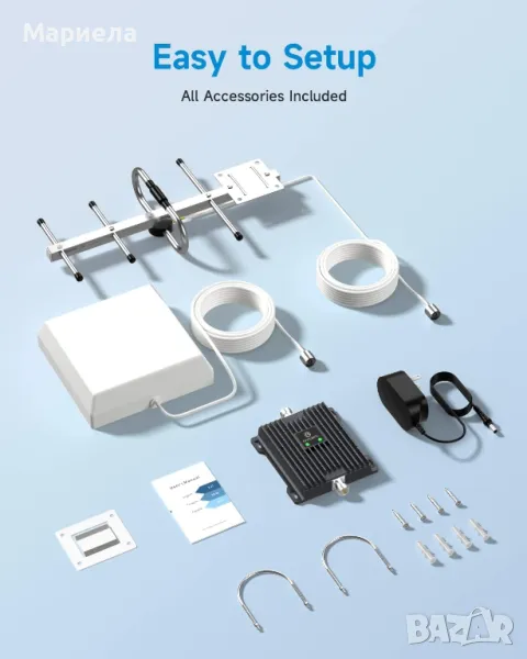 Пакетът "Усилвател на сигнала" включва всички аксесоари; включително захранващи устройства със спецификация на ЕС, кабели за предаване на сигнали, антена, мейнфрейм, инструменти за инсталиране, ръководства за потребителя и др. Ако имате някакви въпроси (въпроси относно честотни ленти, тестови инсталации, дефектни аксесоари и т.н.), ние сме на ваше разположение.