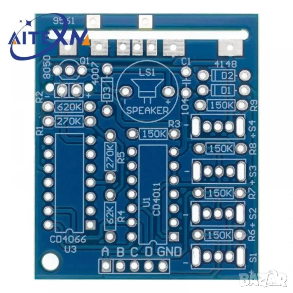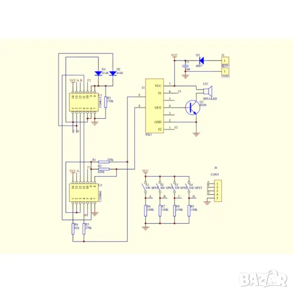 Комбинирайте основната управляваща верига и допълнителната управляваща верига, съставлява пълна управляваща верига, управлявана от A B C D четири двоични кодировки, кара 9561 да произвежда 16 различни звука.