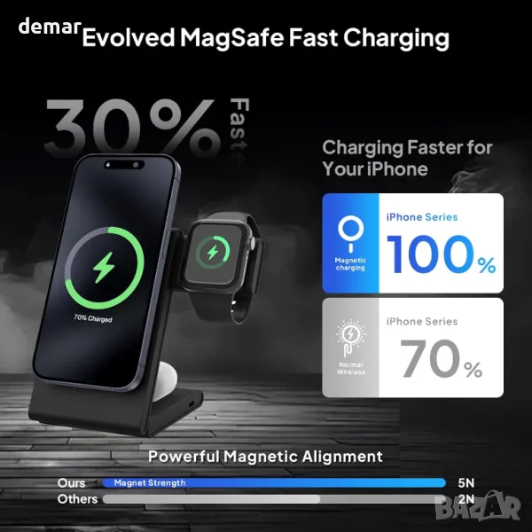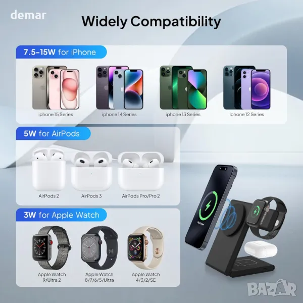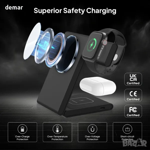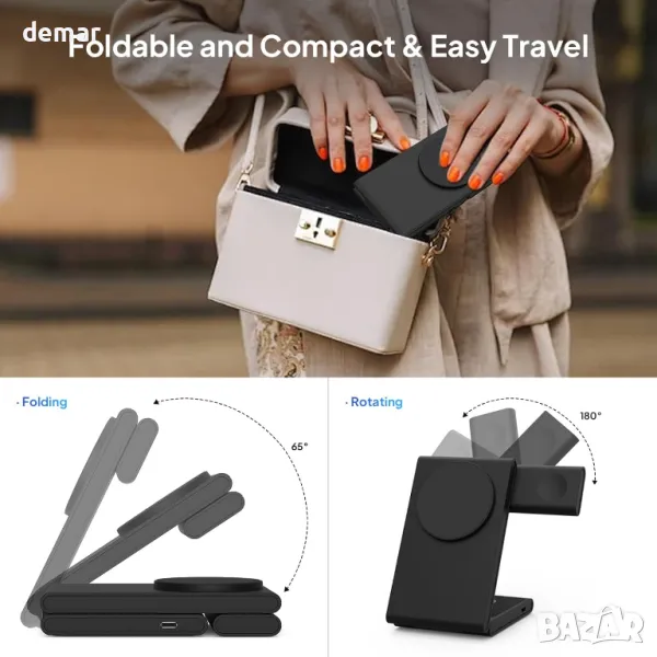 Безжичното магнитно зарядно устройство опростява зареждането, като захранва вашия iPhone, Apple Watch и AirPods едновременно, елиминира бъркотията от кабели и поддържа пространството ви организирано. Той поддържа бързо зареждане за широка гама от устройства на Apple, включително модели iPhone от 12 до 16, Apple Watch Series 1 до Ultra и модели AirPods с до 15 W мощност за телефони, 3 W за часовници и 5 W за слушалки. Неговият компактен сгъваем дизайн се побира лесно в джобове или чанти, с регулируема панта за удобна употреба по време на видео разговори или съобщения. Вградените функции за безопасност предпазват от прегряване, презареждане и късо съединение, докато нехлъзгащите се подложки осигуряват стабилно поставяне на всяка повърхност. Пакетът включва зарядно устройство, Type-C кабел и ръководство за потребителя; за оптимална работа се препоръчва 20W+ адаптер.