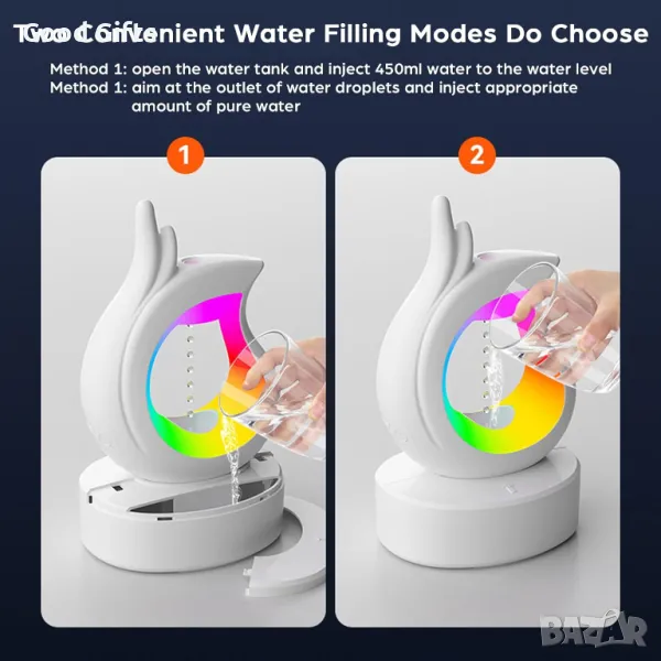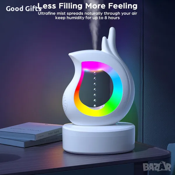 Антигравитационен воден капков овлажнител за въздух с много функции. С него можете да внесете интересно изживяване и релакс в дома и офиса си. Подходящ е за Подарък за любим човек. Този Арома дифузер е с капацитет 450мл вода и може да поддържа влагата 8 часа без нужда от презареждане.