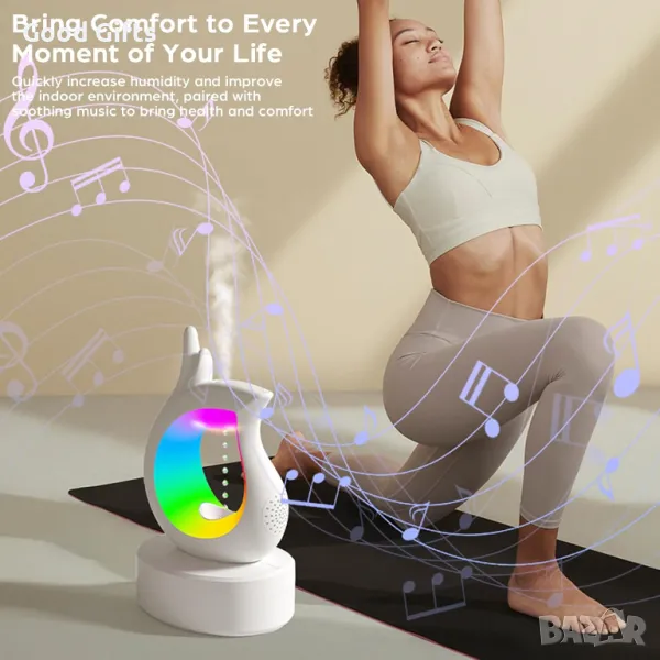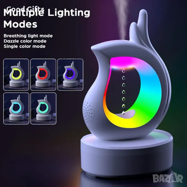 Този овлажнител съчетава в себе си 3 уреда в едно- овлажнител за въздух, Bluetooth високоговорител/колонка и нощна лампа в едно.