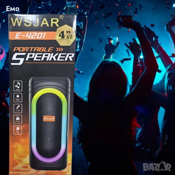 Тонколоната WSJAR E-4201 е компактна и модерна аудио система с LED цветни светлини, която създава динамична атмосфера за всяко събитие.